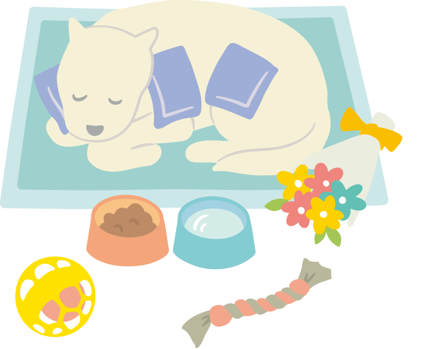 かわいい姿を保つため、保冷剤を頭の下とお腹の上に当て、涼しい部屋に安置します。特に暑い季節は、エアコンの温度を低く設定してください。タオルなどを敷いた上に、ペットを寝かせてあげます。